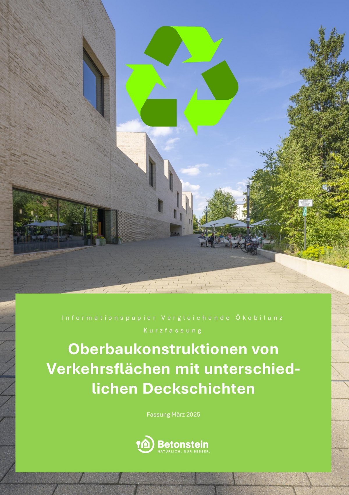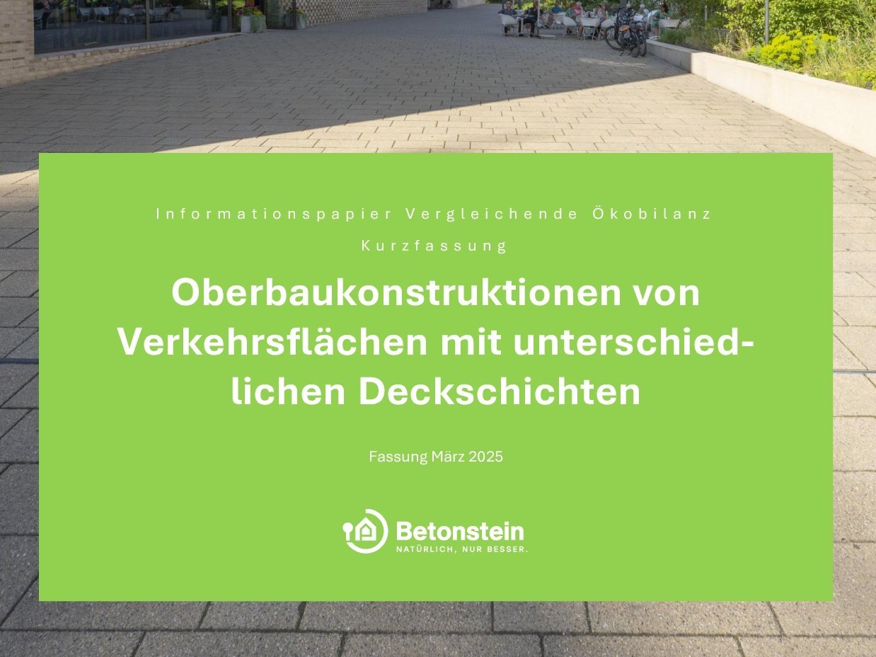 Die unabhängige, vergleichende Ökobilanz zeigt, dass Verkehrsflächenbefestigungen mit Blick auf die im Fokus stehenden Umweltwirkungen – Treibhauspotenzial (CO2-Ausstoß) und Verbrauch von nicht erneuerbarer Primärenergie (wesentliche Energieträger sind Erdöl, Erdgas und Kohle) – am vorteilhaftesten sind, wenn die Deckschicht für die enthaltenen typischen kommunalen Straßenbausituationen mit Betonstein ausgeführt wird.